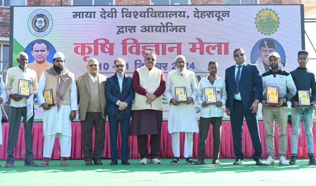 देहरादून, 10 दिसम्बर। प्रदेश के कृषि मंत्री गणेश जोशी ने आज मंगलवार को सेलाकुई स्थित माया ग्रुप ऑफ कालेजेस में दो दिवसीय कृषि विज्ञान मेले का रिबन काटकर शुभारंभ किया। इस अवसर पर कृषि मंत्री गणेश जोशी ने उत्कृष्ट कार्य करने वाले किसानों को भी सम्मानित किया गया। इस दौरान कृषि मंत्री गणेश जोशी ने विश्वविद्यालय परिसर के हर्बल उद्यान एवं प्रयोग केंद्र में तुलसी के पौधे का रोपण भी किया।